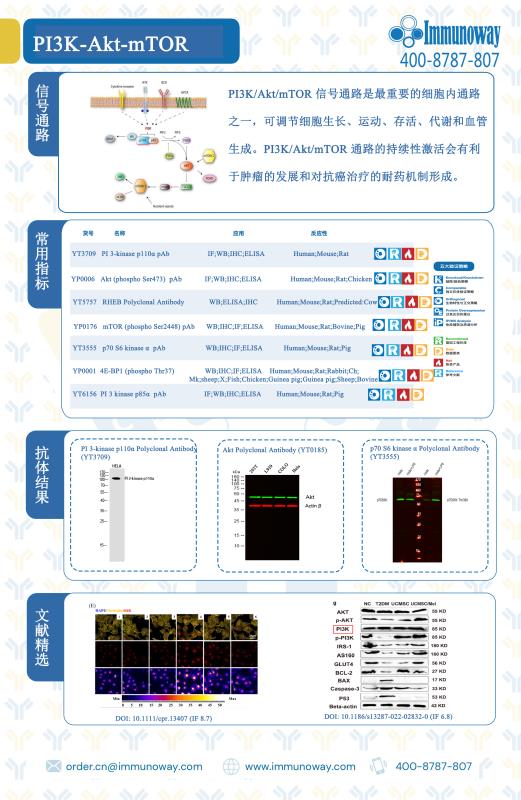 PI3K/Akt/mTOR 信號(hào)通路是最重要的細(xì)胞內(nèi)通路之一,可調(diào)節(jié)細(xì)胞生長(zhǎng)、運(yùn)動(dòng)、存活、代謝和血管生成。PI3K/Akt/mTOR 通路的持續(xù)性激活會(huì)有利于腫瘤的發(fā)展和對(duì)抗癌治療的耐藥機(jī)制形成。