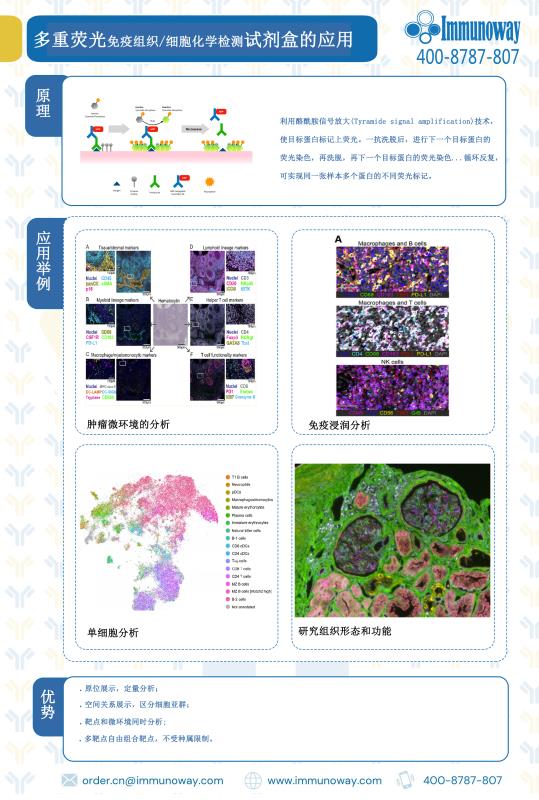 利用酪酰胺信號(hào)放大(TSA,Tyramide signal amplification)技術(shù),酪胺Tyramide與過(guò)氧化物酶反應(yīng)(酪胺在HRP催化H202下形成共價(jià)鍵結(jié)合位點(diǎn)),產(chǎn)生大量的酶促產(chǎn)物,該產(chǎn)物能與周?chē)鞍椎睦野彼釟埢矁r(jià)結(jié)合,從而使目標(biāo)蛋白標(biāo)記上特異的熒光。激活的酪胺共價(jià)結(jié)合酪氨酸殘基上和周?chē)信d趣的表位,然后高溫除去該靶標(biāo)和聚合物-辣根過(guò)氧化物酶(hrp)的非共價(jià)結(jié)合的一抗,而酪胺連接的熒光團(tuán)則保留在組織上。另一種針對(duì)下一個(gè)靶蛋白的一抗隨后可應(yīng)用于組織,并通過(guò)不同的酪胺酰胺連接的熒光團(tuán)顯示出來(lái),然后根據(jù)需要反復(fù)進(jìn)行循環(huán)染色和放大,并考慮抗原測(cè)定的順序,以確保最佳的表位檢測(cè)。使用這種方法可同時(shí)檢測(cè)6-8個(gè)靶蛋白。