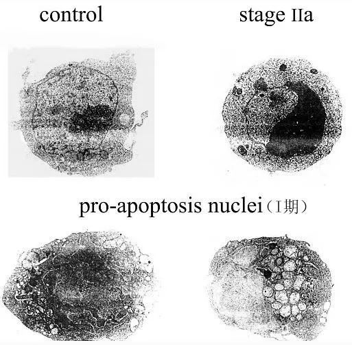 電鏡觀察:可見凋亡細胞表面微絨毛消失,核染色質固縮、邊集,常呈新月形,核膜皺褶,胞質緊實,細胞器集中,胞膜起泡或出“芽”及凋亡小體及凋亡小體被臨近吞噬細胞吞噬現(xiàn)象。