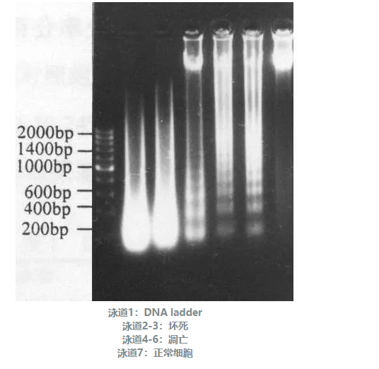 細胞凋亡時主要生物化學特征是其染色質發(fā)生濃縮,染色質DNA在核小體單位之間的連接處斷裂,形成180~200bp整數倍的寡核苷酸片段,在凝膠電泳上表現(xiàn)為梯形電泳圖譜(DNA ladder)。通過提取DNA、電泳、UV下可見DNA ladder。此方法是判斷細胞有無凋亡發(fā)生的一種簡便方法,比較適用于體外培養(yǎng)的非增殖性細胞的檢測。